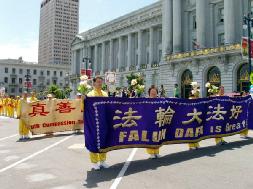 队伍经过主席台时,主办者向观众和媒体们介绍了什么是法轮功,以及法轮功洪传世界。队伍经过之处,博得了观众们的阵阵掌声。