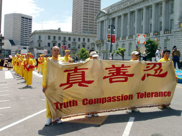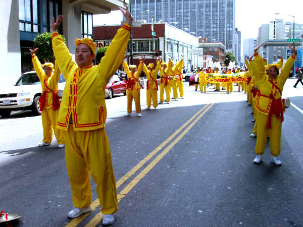 法轮功的队伍最前面是“法轮大法好”,和“真善忍”横幅;跟着是炼功和腰鼓队,学员时而表演中国传统腰鼓,时而演示法轮功的功法。