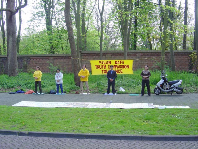 【明慧网2005年4月27日】为了纪念99年4.25万人和平上访六周年,荷兰法轮功学员于2005年4月24日下午,在中使馆前和平请愿,呼吁停止