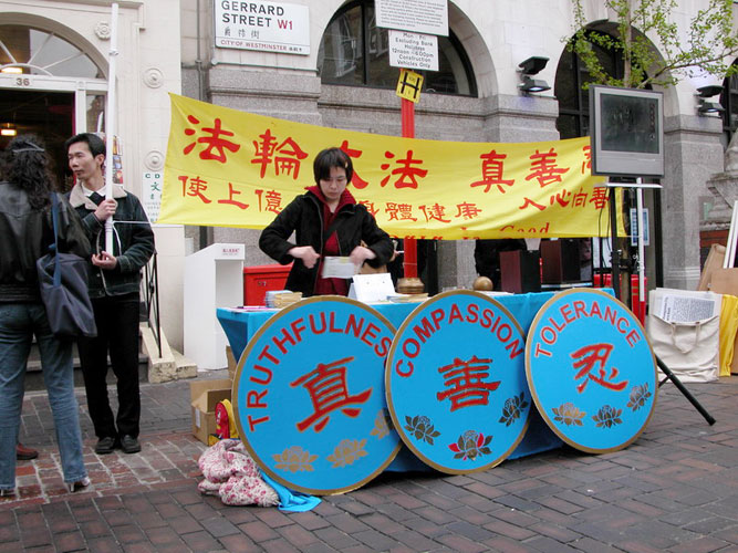 约有30位法轮功学员参加了在唐人街中心地带举行的这次活动,他们当中包括两个刚刚得法不久的英国小伙子,以及一位从中国大陆出来不久并曾经遭受迫害的中国女学员。大家拉开了一面“法轮大法好”的金色横幅,展示了大量的反映法轮大法洪传世界和法轮功学员反迫害的真象展板,这些展板一部份摆在炼功学员身旁的地上,一部份挂贴在行人道的两侧。另外,学员架起一台电视机连续播放讲真象光盘《风雨天地行》。