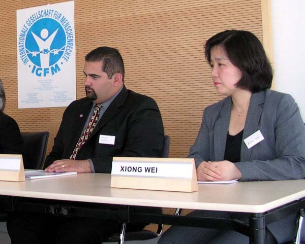 当熊伟看到两位男士在一张法轮功学员在中国受酷刑折磨的画面前停留了一些时间时,就走了过去,给他们讲述自己因坚持修炼法轮功并向民众讲真象而被非法关押在北京女子劳教所受迫害的经历。那两位先生认真的听着。熊伟的名字对国际人权协会的成员们来说并不陌生,在熊伟还在北京女子劳教所中时,国际人权协会就积极为营救她征集签名,递交给德国外交部,还在人权杂志上发表关于她的文章。当熊伟出了劳教所后,国际人权协会也为她能早日重来德国而奔走。在德国当局的协助下,2004年九月二十九日清晨,国际人权协会的代表同德国法轮功学员一同在法兰克福机场迎来了阔别德国五年的熊伟。