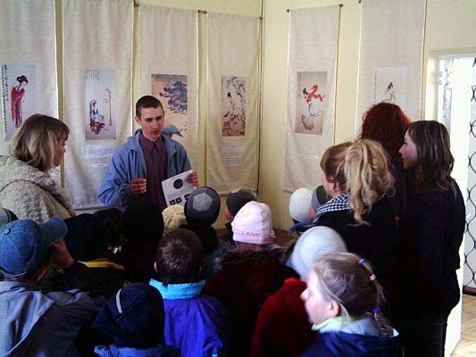 ![]() 学员在讲解图片内容 | ![]() 一群小孩也来参观展览,并且都认真听学员讲解 | ![]() 当地电视台采访拍摄展会现场 |