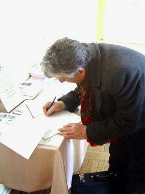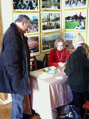 ![]() 人们在留言簿写下自己的意见,并签名支持停止迫害法轮功 | ![]() 学员在教参观者们折叠纸莲花 | ![]() 正义的人们签名支持法轮功,谴责在中国的迫害 |