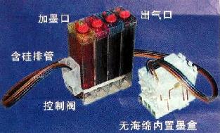 连续供墨系统,一般在喷头与墨盒分体式的喷墨打印机上使用,它是利用打印机的墨盒中有一个吸气孔,打印时要吸入空气,只要从孔中接入一条连到墨水瓶的胶管,利用打印机打印时墨盒内产生的负压,从打印机外的墨水瓶中抽取墨水打印。我查阅了很多资料,网上的制作介绍讲得复杂,且不易操作。而我制作出的这套连续供墨系统,不但操作简单,而且成本很低,只要5元。