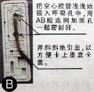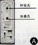 取出打印机的黑色墨盒(墨水已用完),将墨盒上端的商标纸撕掉,就能见到顶端有两个小孔(示意图A),有沟槽连到孔边的是墨盒呼吸孔,另一个是加墨孔。把空心胶管浅浅的插入墨盒呼吸空中(示意图B),将AB胶各挤出一点在玻璃上,混匀后快速将呼吸孔和胶管的空隙密封好,并将墨盒中部的加墨孔也封死,胶水未凝固时,在墨盒的表面用手将胶管尽量压平,使它紧贴墨盒顶端,改装好以后装到打印机里时就不会顶住墨盒卡盖,两分钟后,胶水凝固,改装便完成了。