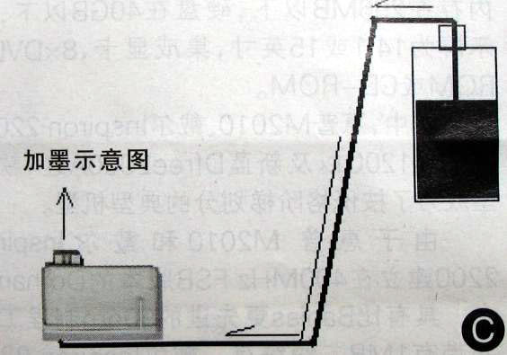 墨水加满后,将墨水瓶放到稍低于墨盒的位置,将墨盒擦干净,放入打印机中,把小胶管拔到不影响墨盒盖关闭的地方,关闭上墨盒盖,这样就算完成了黑色墨盒的改造了。有些较专业的连续供墨系统改装者,总是喜欢将墨盒卡盖拆掉,只用纸屑垫实墨盒或者使用铁夹固定,我认为这不是好方法,因为没有压力压住墨盒,墨盒出墨孔的位置会因为漏气而抽不上来墨水,造成供墨失败。