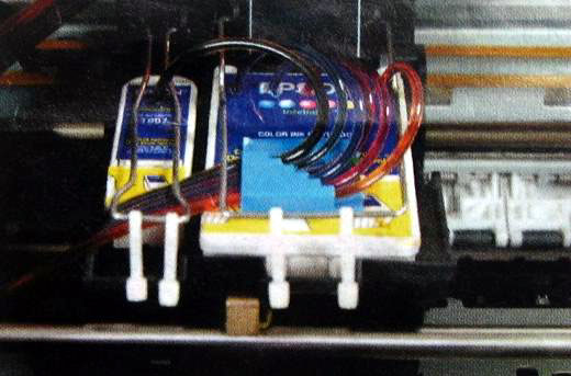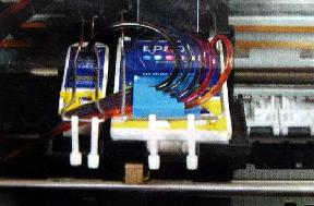 ![]() 拆掉墨盒卡盖,改用铁夹固定墨盒的连续系统 |