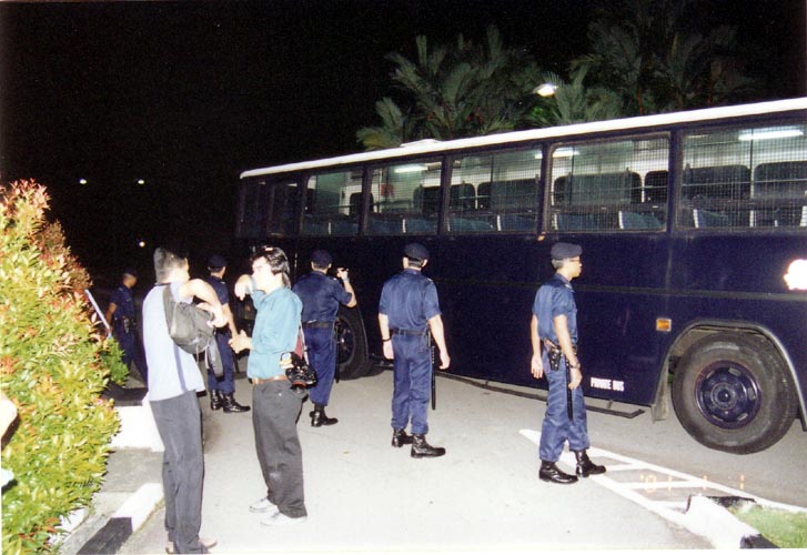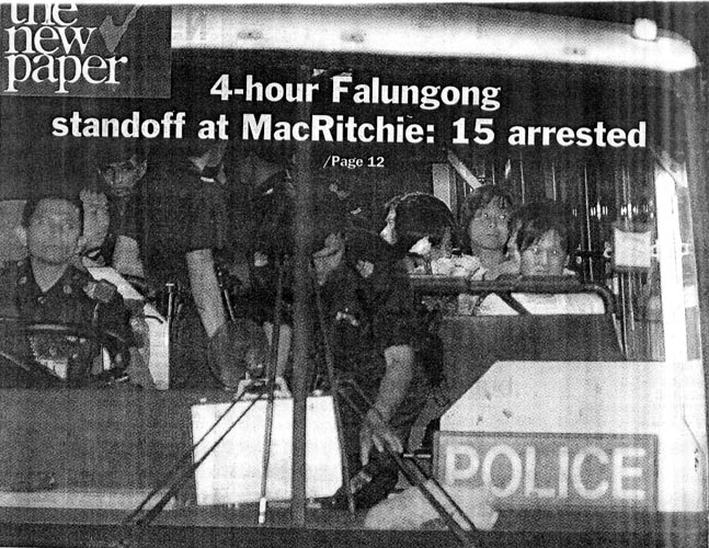 但当时警方不听我们的解释,调来很多警力,还出动了特警,那种防暴警察,开来了三辆大型警车、多辆小型警车。警方的行为严重伤害了学员们的心,我们一直在向他们讲清我们在做什么,希望他们不要那么做。经过大约三个小时的对话,没有结果,警方当时强行没收了我们的展板,拘捕了15名学员。后来这15名学员被控上法庭,7人被判入狱一个月,8人被罚款1000新币。这就是新加坡当局在中共集团公开迫害法轮功以后,为了应和中共,第一次扮演了迫害善良的角色。