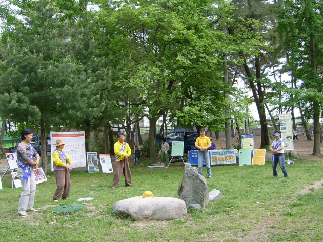 2005年4月29日到5月2日大会期间,法轮功学员们在体育馆前的树林里摆放好了图片展板和签名台。由于图片展区的前后有跆拳道和摔跤竞技场,从而可以尽情向各地的选手和游客们讲真象。悠闲的游客们在树荫下观看真象图片,听学员们的说明,他们为中共江氏集团的邪恶镇压而愤怒,而后又欣然为营救法轮功学员高成女而签下自己的名字。