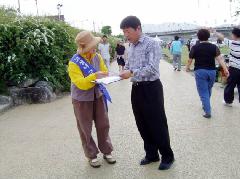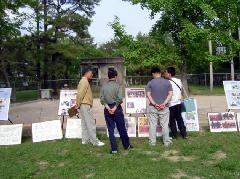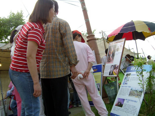 大会期间,法轮功学员们不仅对聚集在展板前的人们讲真象,还到舞台周边、人流涌动的路边去讲。节目间歇,游人们停下脚步,观看揭露中共侵犯法轮功学员人权的图片,并积极为营救高成女而签名,还很关心的拿走了真象资料。带着学生来的老师,白发苍苍的老人,都用心聆听了学员们的说明。三三两两结伴而来的各阶层的人们仔细的观看了学员们的炼功动作,领略法轮功的优雅风姿。