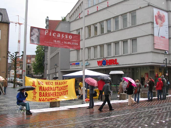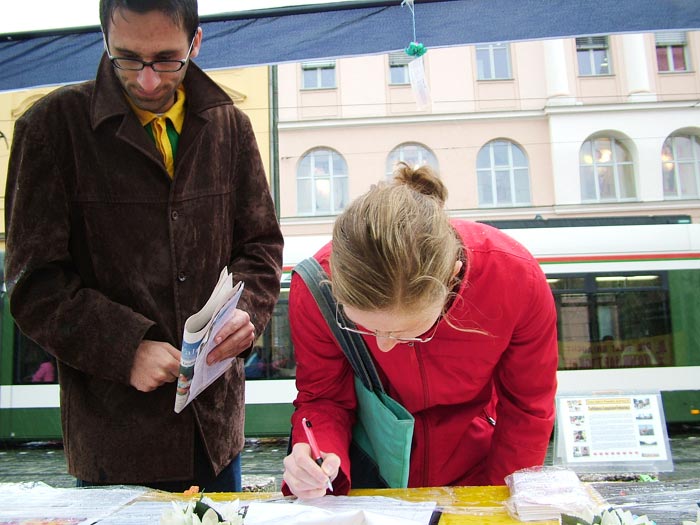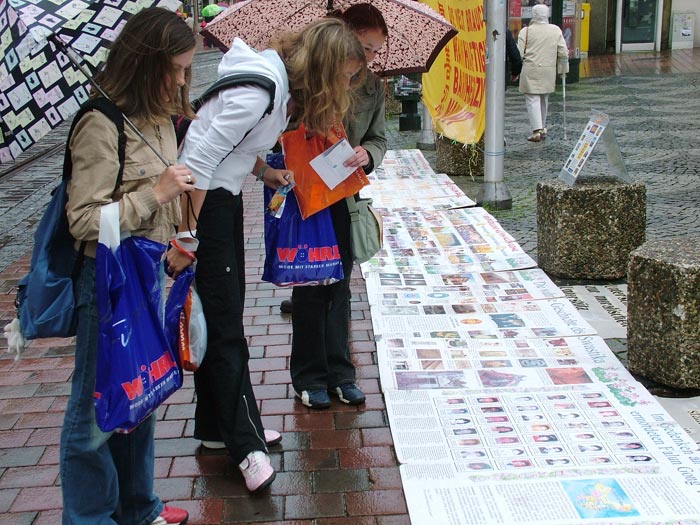 络绎不绝的行人纷纷接过学员递来的资料,有的边走边看,有的在车站等车时认真阅读。也有很多人冒雨停留在展板前,认真观看,有的还用手抹去展板上的雨水,再仔细的看。人们都被这些发生在中国的残酷事实所震惊。当学员问到是否知道法轮功时,不少人都说知道,在其它地方也看过真象资料,有的马上签名支持法轮功,有的给学员们鼓励,希望能够成功制止迫害。