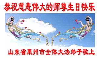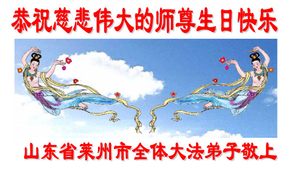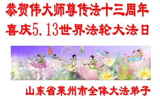 在喜庆2005年5月13日世界法轮大法日到来之际,山东省莱州市全体大法弟子恭贺慈悲伟大的师尊传法十三周年!向师尊致以最崇高的敬意,感谢师尊的慈悲苦度!