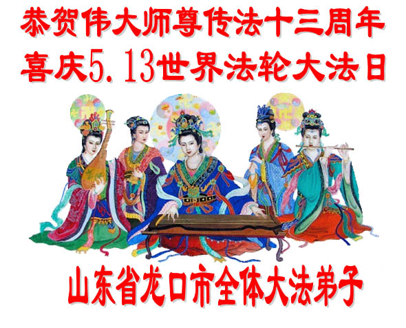 在喜庆2005年5月13日世界法轮大法日到来之际,山东省龙口市全体大法弟子恭贺慈悲伟大的师尊传法十三周年!