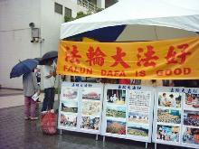 几位上了年纪的学员一直穿着雨衣或撑伞发送资料,因为他们都是在大法中修炼数年的亲身受益者,不畏风雨的前来告诉大家:大雨终会停歇,就像法轮功清白蒙尘,真象大白于天下之日即将到来。