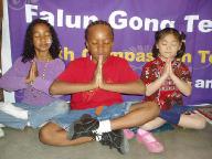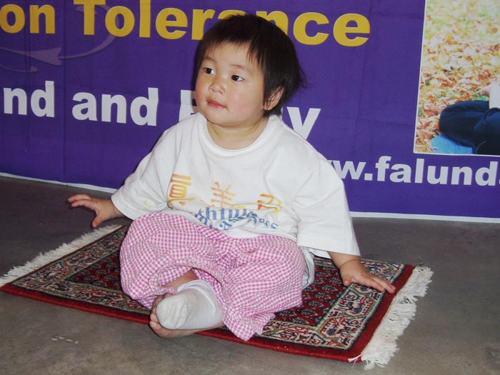 法轮功小弟子也起到了洪法作用,并且在其中提高着自己。来参加活动的孩子非常多,一位小姑娘经过时,停下来看功法表演,有学员叫六岁的小弟子真真教她功法,起初真真还不太乐意的教,教着教着,她的脸上就有了笑容。教完了,那个小姑娘专门回来给真真一块糖作为感谢。不多久,又有孩子经过,这次我们的真真小弟子就象老弟子一样老成的和妈妈一起给小朋友教功,最后,单独教小朋友们盘腿。结束后,那个学功的小男孩非常恭敬的双眼微闭给真真合十。大人看在眼里,明在心里,这些孩子明白的一面知道自己得到了什么。真真也告诉妈妈说她后来自己想通了,应该好好洪法,所以就很高兴了。更有趣的是,在一边玩的一岁多的小妹妹忍不住也要盘腿洪法。把过路的人都逗乐了。