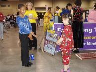 虽然法轮功学员的摊位并不比别的摊位大,但却格外的受欢迎,几乎每一位经过的人都会停下来看看,有的学员做义工,有介绍功法的,有做功法表演的。很多西方人对大法都很支持,象往年一样,许多人对功法本身就非常感兴趣,当地学员为了配合这次亚洲节,已经安排好了这次节日过后的免费教功班,几百份印有免费教功班与平时固定炼功时间信息的资料很快就发光了。也有一些中国同胞在看过《九评共产党》后对共产党的邪恶有了很深的认识,对学员们揭露迫害和讲清真象的行为表示理解和支持。遗憾的是至今还有中国人无法摆脱中共制造的恐惧感,有人远远的看着法轮功学员的摊位,有人故意装作不在乎的样子。