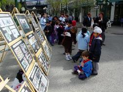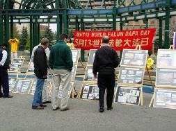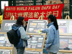 ![]() 法轮功学员向过路行人讲真象,善良的人们简直不敢相信中共竟会迫害如此善良的法轮功修炼者。 | ![]() 中午休息时间,过路行人在观看法轮功图片展 |