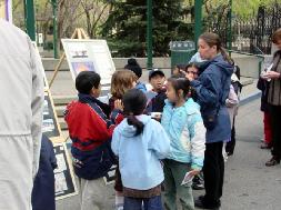 ![]() 一班小学生路过,纷纷向法轮功学员索要真象光碟和传单,其中一位小朋友在展板前双腿盘坐,双手合十,十分虔诚。 | ![]() 带队的老师在给学生讲解:法轮功是和平的打坐锻炼。 |