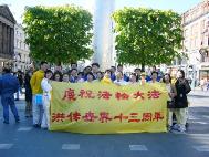 二零零五年五月十四日星期六下午,比利时法轮功学员及部份荷兰和瑞士学员在比利时首都布鲁塞尔市中心的LA MONNAIE广场举行活动,热烈庆祝第六届世界法轮大法日暨师父传法十三周年,并恭贺师父生日快乐。