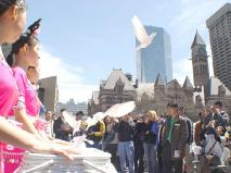 2005年5月13日上午11时30分,世界法轮大法日的庆祝活动在加拿大多伦多市府前的 Nathan Philip Square 开幕。