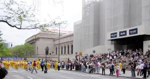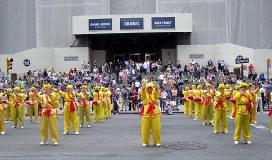 “法轮大法好”的歌声伴随着腰鼓队走过了整个游行路线。其间腰鼓队还穿插着进行了第一套功法演示。特别是在看台前和大都会博物馆前,学员的功法演示博得了阵阵掌声。