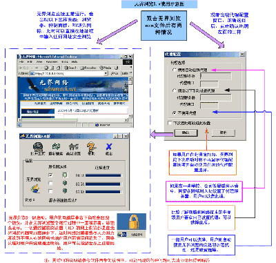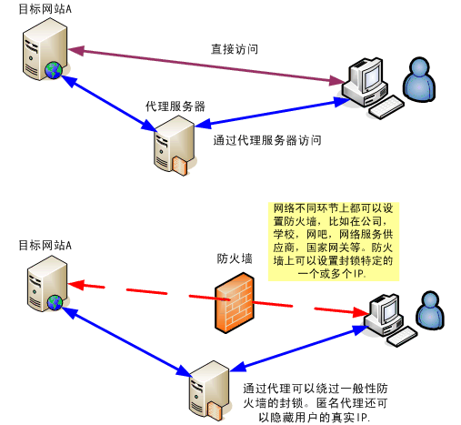 为了理解突破网封的方法,就要了解代理服务器的原理和使用。如下图所示,我们一般访问一个网站(如网站A),都是直接访问。网站A知道访问者的IP。我们还可以通过代理服务器访问网站A。这时,我们和网站A的数据交流都是通过代理中转的。代理有很多不同的类型,如HTTP代理、POP3代理、FTP代理、SOCKS代理等,每种代理针对不同的服务类型。我们平常浏览网页用的代理是HTTP代理。从另一个角度代理可以分为匿名代理和透明代理。匿名代理隐藏用户的IP地址,透明代理不隐藏用户的IP地址。