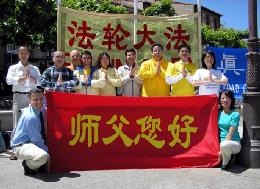 大家来到广场正中心,准备在一侧摆放法轮大法洪传世界的图片,另一侧摆放法轮功学员在中国受迫害的图片。第一张大法洪传世界的图片还没放稳,就已经有人过来要求学功了;当学员们了解到这里的人们很多都没有听说过法轮功时,大家的心真是很急,虽急,但配合的却井然有序,很快各就各位:演示功法的、发传单的、演讲的、在签名桌前服务的……温暖和煦的春风则将优美祥和的炼功和“普度”“济世”音乐飘向广场四方,吸引着一群群游客和市民前来认识和了解法轮大法。