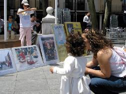 法轮功学员们来到市中心广场才知道当日是马德里圣-伊西德罗节(SAN. ISIDRO)(圣-伊西德罗是马德里的保护神)。广场上搭起了舞台,鼓手、乐队、演员都在匆忙准备,抚琴调音的、练唱的,跃跃欲试,广场上分外热闹。大家选定了地点,就在广场的正中心庆贺法轮大法日和洪法讲真象。