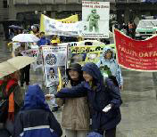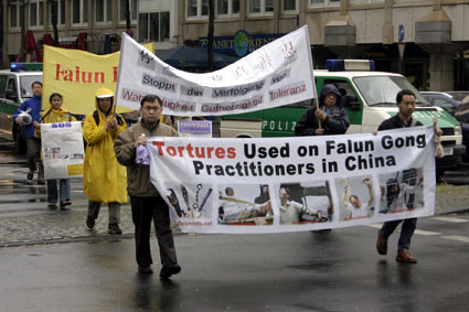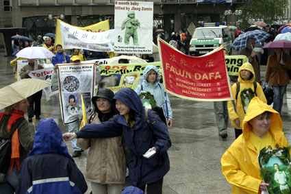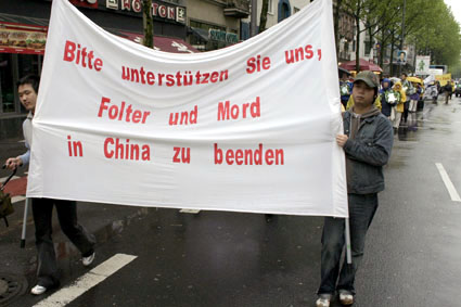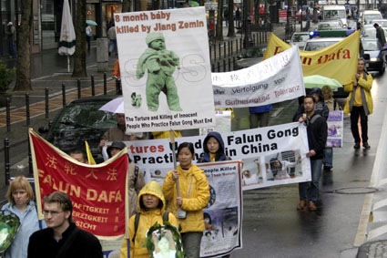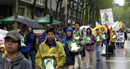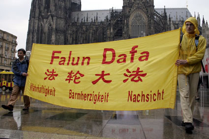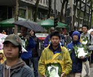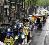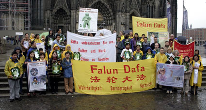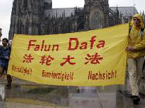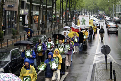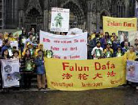 【明慧网2005年5月18日】为庆祝世界法轮大法日暨法轮大法洪传十三周年,德国北莱茵州(Nordrhein-Westfalen)法轮功学员于五月十四日在科隆(Koeln)市冒雨举行了庆祝游行活动。