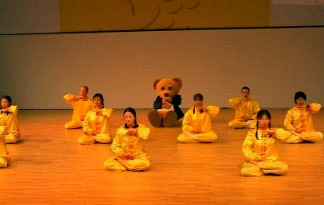 主持人瑞克那格先生的谈吐十分轻松、幽默,而且便于观众理解。他本人修炼法轮功多年,曾为呼吁制止迫害法轮功,到过天安门广场和平请愿。当他介绍法轮功的功法时,在座的许多观众不禁站起来,边看边学,时而高举,时而伸展的手臂,如同渴求光明的枝芽,密密的一大片。有些干脆跑到场上来,直接跟学员学。一位六、七岁,身着粉红色连衣裙的小女孩,稚气十足却有板有眼的跟着学炼了全套动功。最引人注目的是一只象征着柏林的吉祥物——“ 熊”,也情不自禁跑到台上,学着学员们的样子炼功。