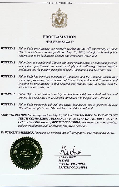 鉴于,法轮大法修炼者于2005年5月13日欢庆法轮大法洪传13周年,并于5月在整个加拿大举行庆祝活动;