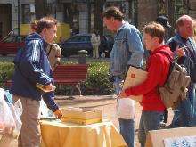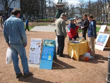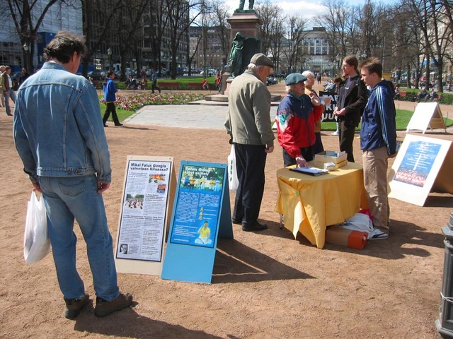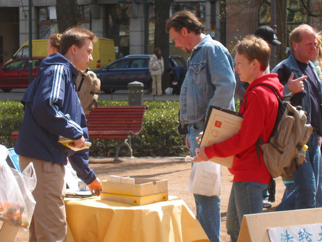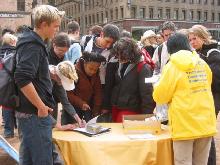 善良的人们不断前来观看展板,关注发生在中国的残酷迫害。了解迫害真象的人们纷纷签名表示对法轮功学员们的支持和同情。有一队外国年轻人还排着长队依次签名,由于急于去赶车,队伍后面的几人便没能来得及签名,他们非常遗憾,问回去后可否发电子邮件签名支持法轮功。不情愿的转身离去后,当他们发现同伴还没走时,立即又返回来为支持法轮功签上了他们的名字。