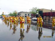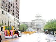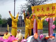 一百多个参加队伍 ,花车精美 ,服饰华丽;具东方传统的法轮功学员队伍在其中气宇轩昂 ,非常醒目。密西根法轮功学员除了提供花车与法轮大法功法演示外,还组织了一支包含有中、外、男、女、老、少等约三十人的腰鼓队,清脆响亮的鼓声,合着“法轮大法好”的音乐,带给观众清新的心灵感受,老老少少的观众也自然的挥手致意或向法轮功学员报以会心的微笑。