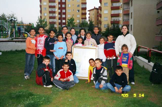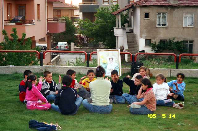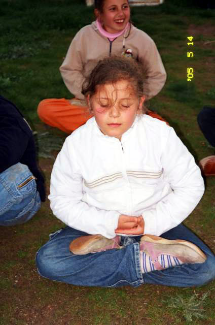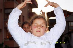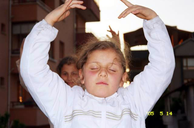 ![]() 小弟子学功 | ![]() 约20个新小弟子在炼功后向师父问好 |