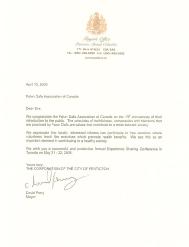 加拿大不列颠哥伦比亚省潘提克顿市市长David Perry于2005年4月15日致信加拿大法轮大法协会,祝贺法轮大法洪传13周年。