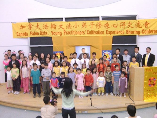 心得交流后,小弟子们还表演了文艺节目。来自多伦多的Victoria弹奏了一首动听的古筝曲,Cindy给大家唱了一首歌“请与我比邻而坐”。明慧学校幼儿班的小朋友们上台背诵了《洪吟》里的3首诗,多伦多莲花艺术团的几名小演员表演了优美的扇子舞。最后,全体大法小弟子一起上台唱起了“法轮大法好”。