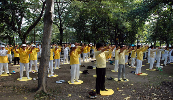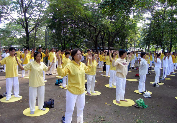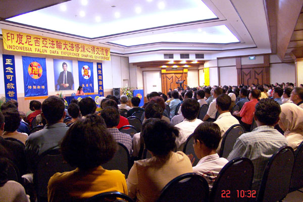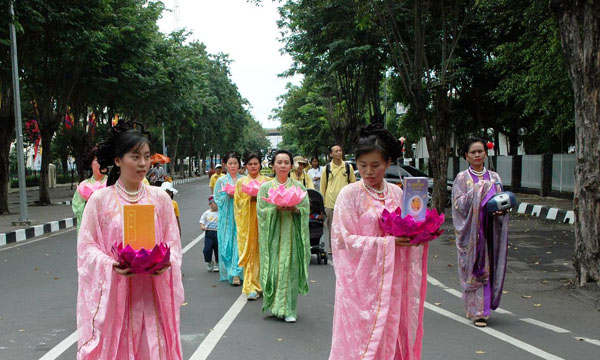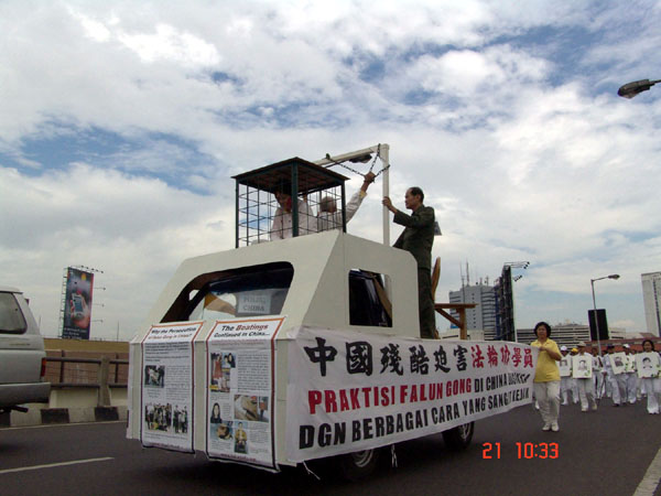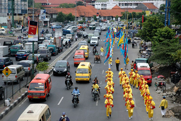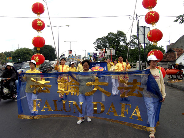 【明慧网2005年5月26日】为庆祝法轮大法洪传十三周年,来自印尼各地,包括棉兰,雅加达,三宝垄,Solo,Tulung Agung,Pasuruan,Sidoarjo,Probolinggo,泗水等地的法轮功学员,于2005年5月21-23日聚集泗水,举行盛大游行 ,集体炼功,以及心得交流会等系列活动。