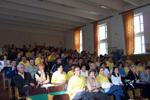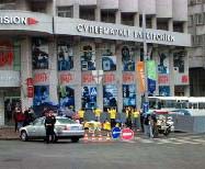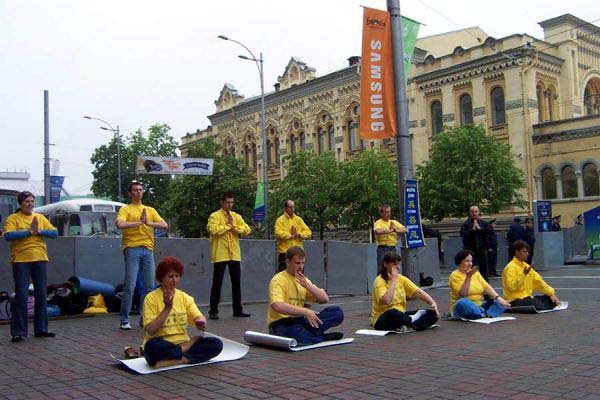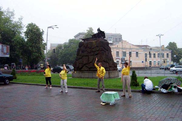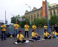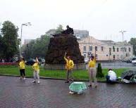 这样的游行对于基辅市民来说是独一无二的,吸引了很多的民众来观看并高兴的接受了法轮功真象传单。整个游行队伍从阿尔谢那勒广场出发。几分钟后游行队伍抵达驻基辅的中使馆。游行队伍停留在中使馆前约10分钟发正念。然后队伍继续前進。
