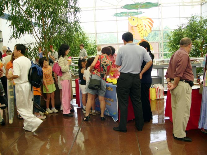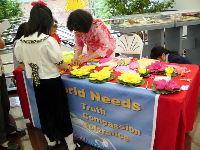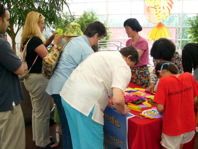 学做莲花的游客把法轮功学员的摊位挤得满满的,有时甚至有两三层人围那儿等着,孩子们索性挤進摊位里侧。一位筹委会工作人员几次过来帮助把人群拨开,让他们不要挡住挂在台前的法轮功旗,可是不一会儿人们又围上来了。4、5位学员一整天几乎没有离开摊位不停的一边教、一边述说着法轮功的真实故事,仍然应接不暇。两位西人学员想过来帮忙,不得不站在外围向人们讲真象。活动从早上10点开始到晚上5点结束,可是直到6点还有游客在听法轮功真象,和学做莲花。