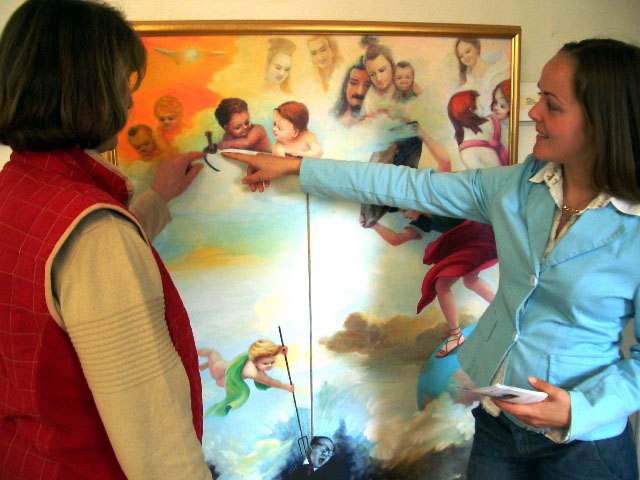 大厅中正在办展览的展出者也走了过来,两位女士花了很长的时间与学员们谈论有关画展的事,其中一位非常感动,她说当她听到有关这些绘画的背景故事时起了鸡皮疙瘩,她告诉学员,她来自欧洲的一个共产国家,她了解恐怖的共产政权是如何对待普通的公民。隔天她又回来拍这些绘画的照片,并表示她不想让这些画离开她的视线。