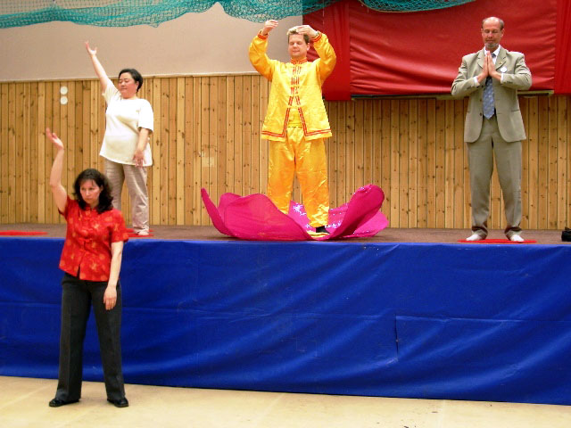 在展览厅里,学员们在大型的舞台上演示法轮功五套功法,一位学员透过麦克风讲解有关功法的效用与修炼的故事,组织者前来表示这些表演看起来非常好。博览会结束前,他们用扩音器宣布,每一个有意愿的人,在回家前都可以到舞台上来学炼法轮功。