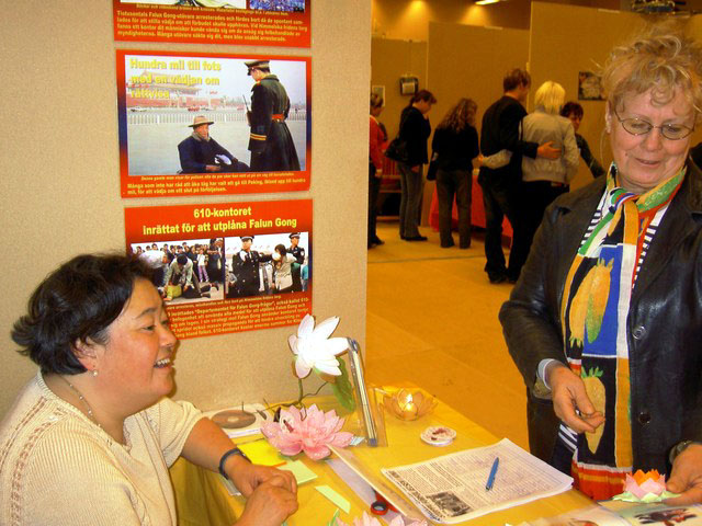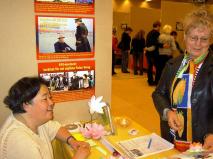 一些学员与其他的参展者交谈,其中一位参展者说,虽然这次没有她所期待的那么多参观者,但是她仍然感到很值得来,因为她有机会更进一步了解法轮功,她借了入门书籍《法轮功》,并坐下来读。