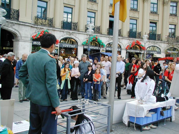 2005年4月30日,来自德国南部帕索(Passau)、奥古斯堡(Augsburg)、乌尔姆(Ulm)和慕尼黑(Munich)等地的法轮功学员聚集在慕尼黑的卡尔斯广场(Karlsplatz),举办纪念“4·25”六周年的活动。广场上人头攒动,早已将法轮功学员表演的反酷刑展围得里三层外三层的,被震惊的人们看着这一切,不断的向学员们询问着,索取资料。许多人在了解了法轮功的真象后,主动到展台前签名支持起诉迫害元凶江XX,呼吁营救法轮功学员姜仁政一家(姜仁政全家不久前因申请避难被拒,被德国政府遣送回中国,姜仁政随后被中共当局判三年劳教,详情请看明慧报道(姜仁政被非法关進劳教所 德国学员吁各界关注)。