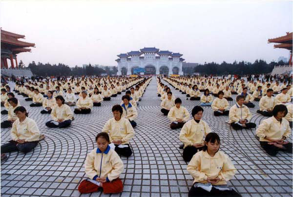 ![]() 万名台湾学员 总统府前炼功 | ![]() 台湾学员中正纪念堂集体炼功 |