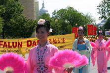 ![]() 花车 | ![]() 仙女队 | ![]() 法轮功学员的队伍深受欢迎 |