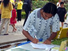这些善良的市民,在了解真象之后,都纷纷签名支持法轮功。尤其一群为数十多人的女学院生,每个都义不容辞的签上自己的名字。由于签名的人很多,以致学员们所准备的征签纸都签满了而必须在纸背后划线,继续让大家签名,但是最终还是不足以应付众多想签名支持正义的人士。