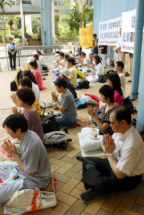 法轮功学员上午11时多从夏悫公园出发,游行到领事馆所在金钟海富中心对面的人行道静坐请愿。他们打出“新加坡:勿做中共帮凶,停止参与迫害法轮功”、“法办江泽民、罗干、周永康、刘京”及“法轮大法好”等横幅,要求新加坡立即撤销错误判决。香港学员步行到新加坡领馆门前,向领馆人员递交请愿信。