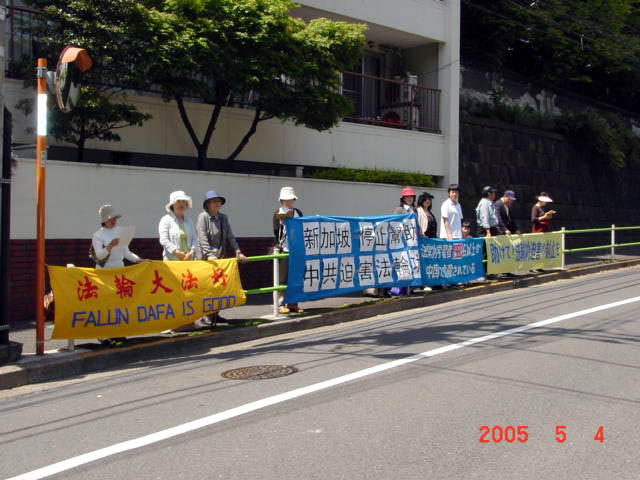 【明慧网2005年5月5日】日本法轮功学员继2005年5月1日来已连续四天在新加坡使馆前抗议新加坡法庭对法轮功学员的不公正判决,希望新加坡政府了解真象,认清时势,不被中共的淫威所惑,不当中共