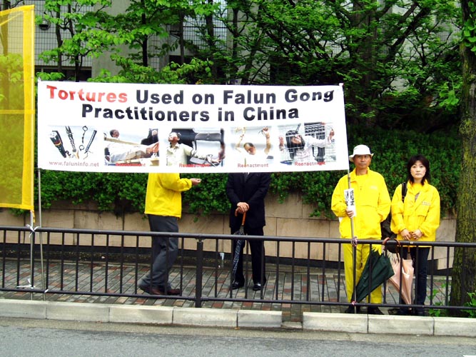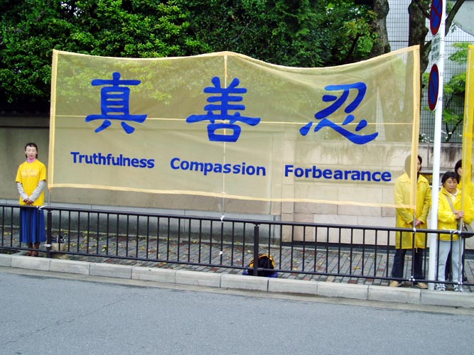 日本法轮功学员为了尽快停止发生在中国的对法轮功学员的迫害,呼吁更多的人们关注中国的法轮功学员,6日到7日在会场附近举行了呼吁停止迫害的活动。法轮功学员在各国外交大臣的必经之路上打起了“停止迫害法轮功”,“法轮大法好”,“真、善、忍”,“15个国家正在起诉江××”的横幅以及揭露迫害的图片等。许多路过的人都停下来观看,询问。并对发生在21世纪的这种迫害感到不可思议。更多的人通过学员的讲解了解了中国这场迫害的真象,并对法轮功学员表示支持。