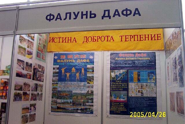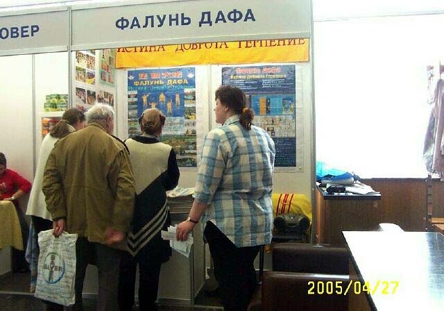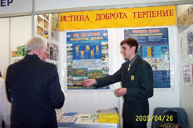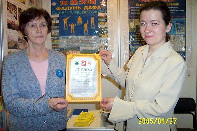 ![]() 展位前的观众 | ![]() 展台前炼功 | ![]() 为莫斯科法轮大法学会颁发的奖状 |
